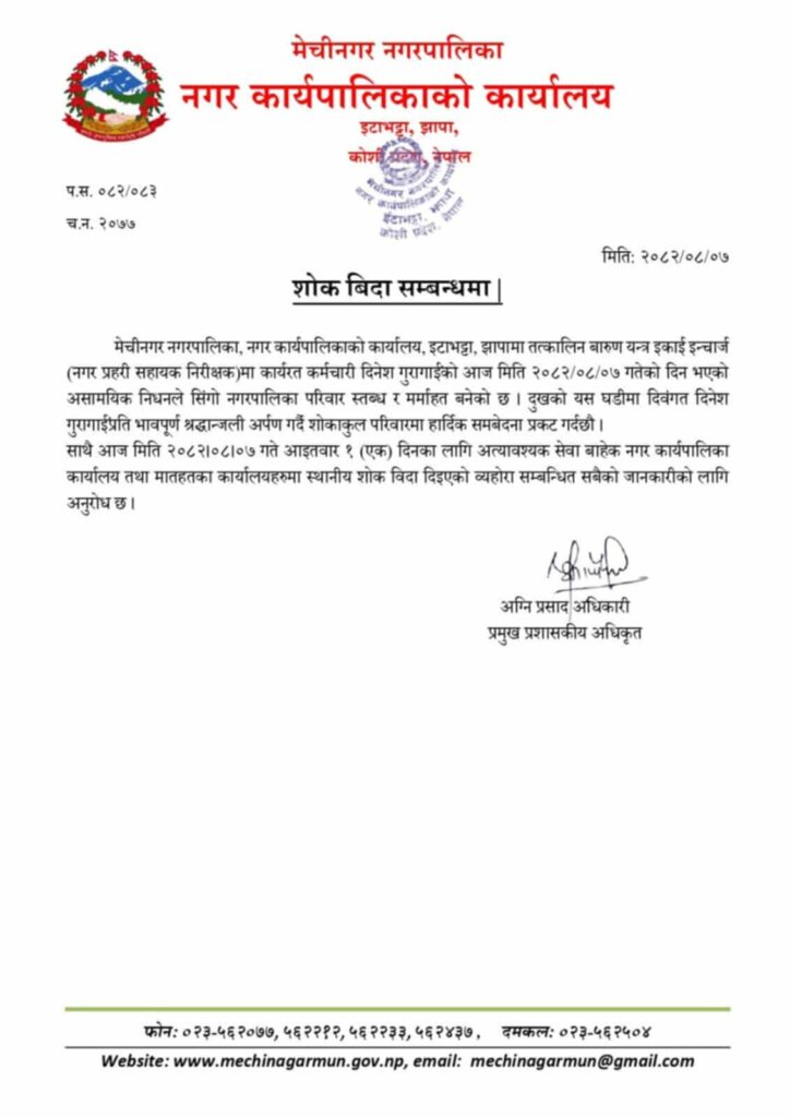नगरप्रहरी गुरागाईको निधन, मेचीनगरद्वारा शोक विदा